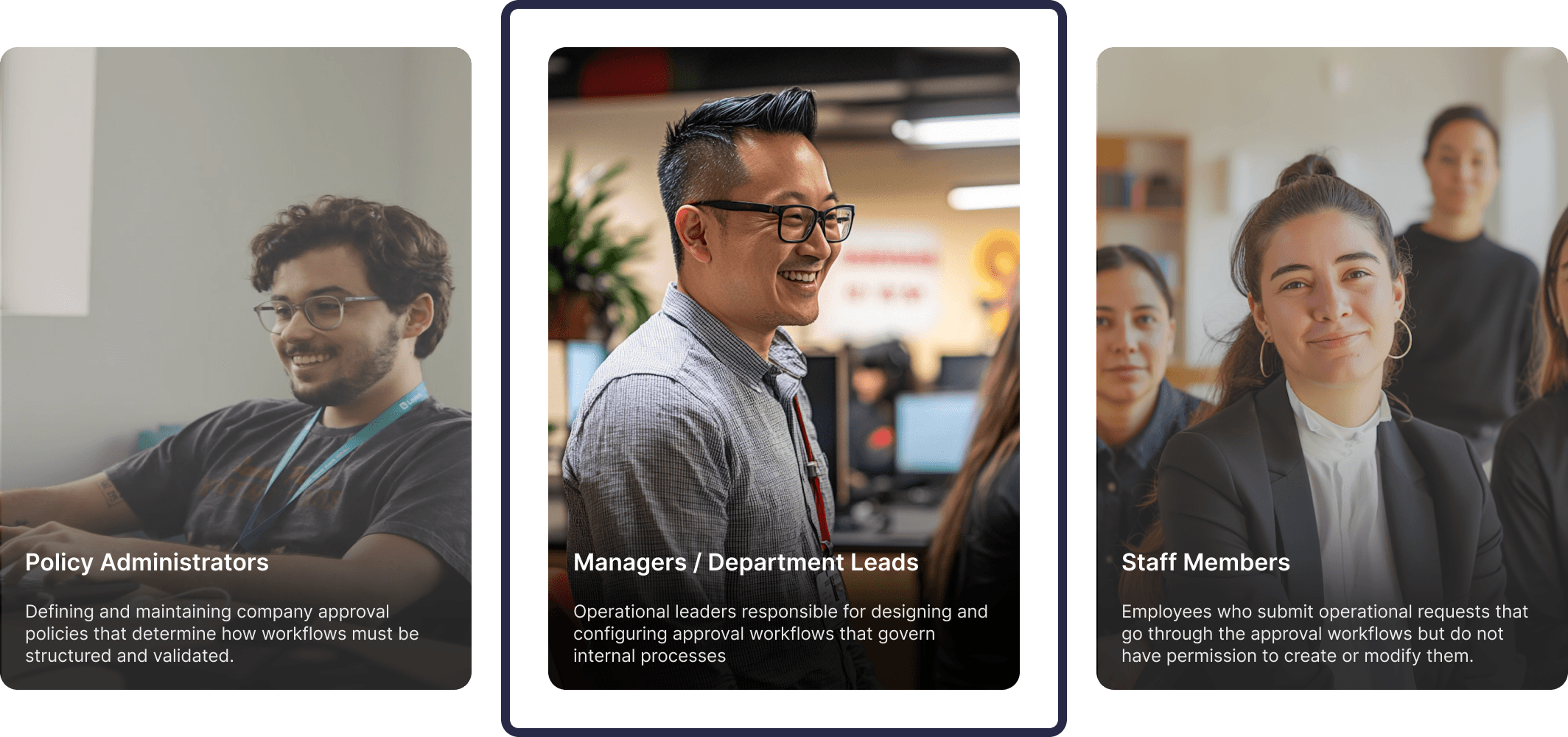 Behind the interface, the workflow builder connects multiple actors and systems to enforce company approval policies.