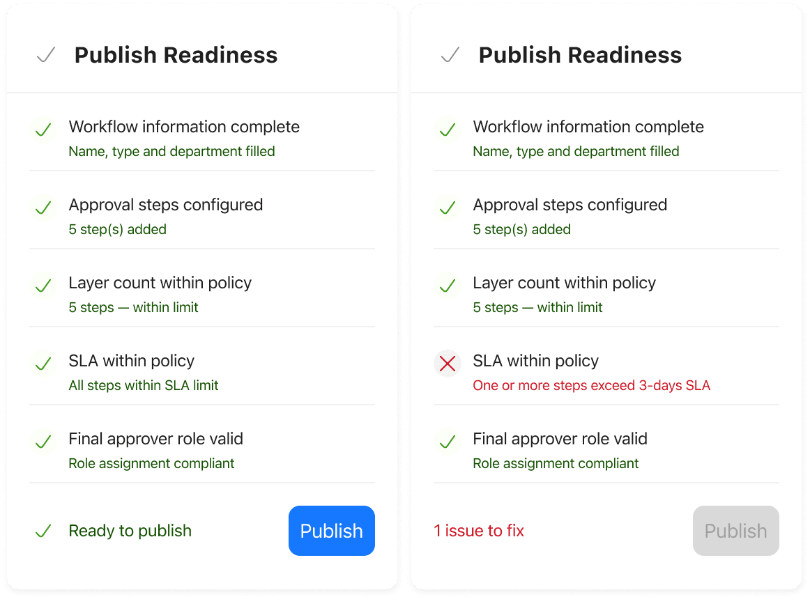 Reduce workflow publishing failures caused by late discovery of policy violations.