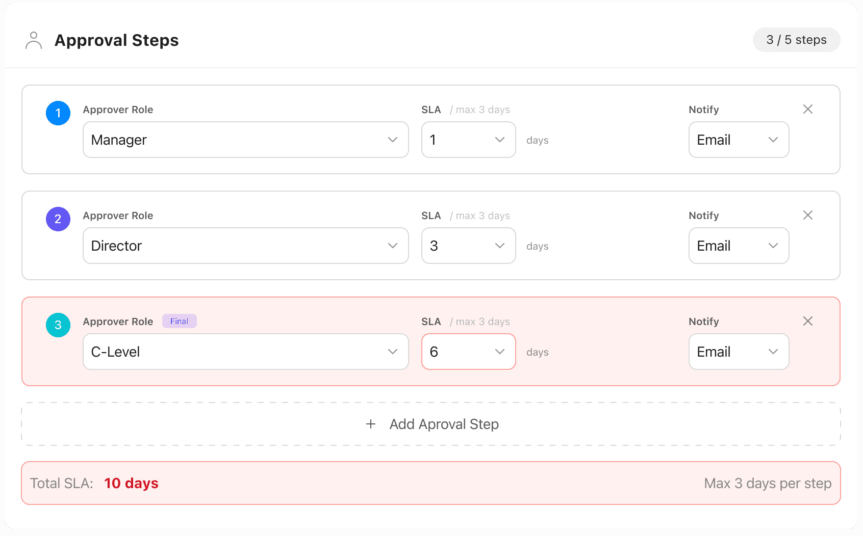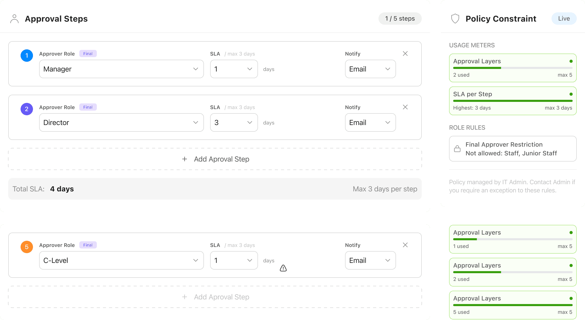 Automatically enforcing approval structures could reduce flexibility. Instead, the system provides guidance while allowing managers to configure workflows freely.
