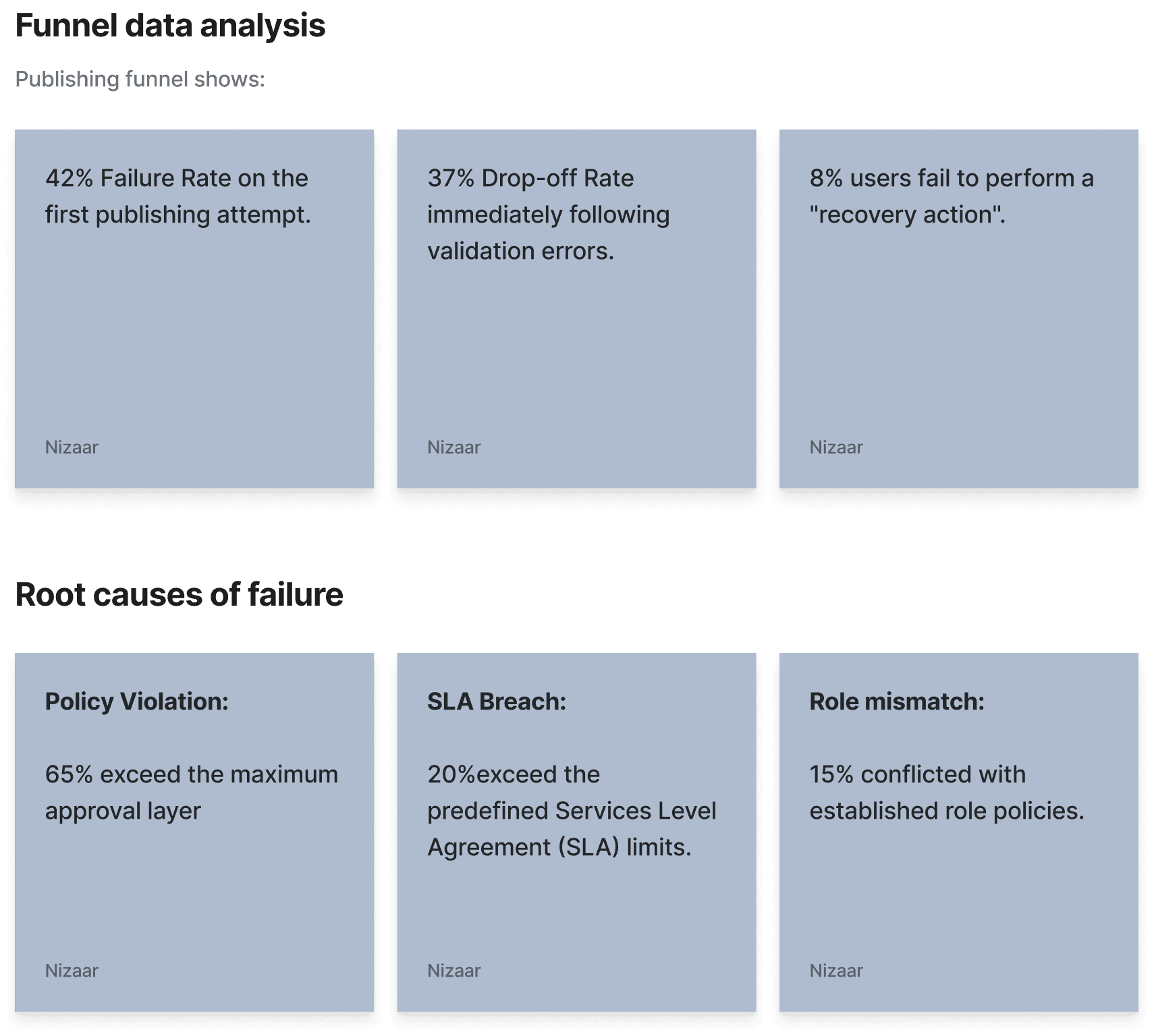 I analyzed potential causes behind workflow publishing failures. Through affinity mapping, several patterns emerged that explain why managers struggle to successfully publish workflows.