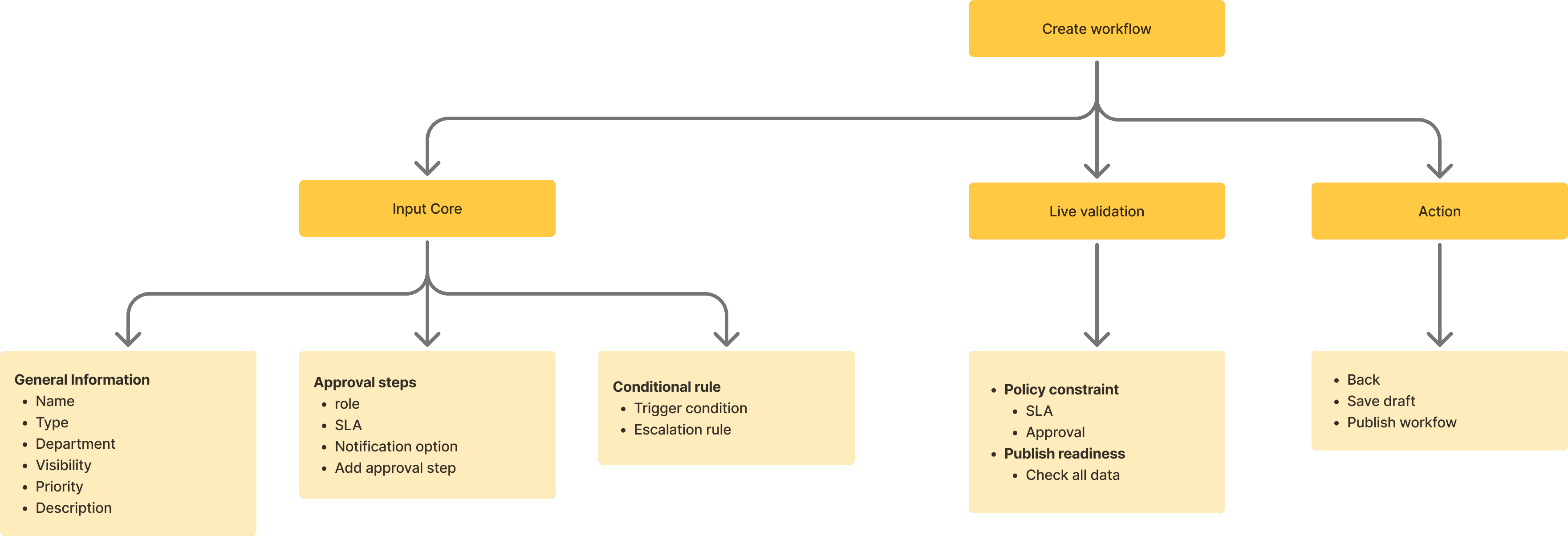 To support proactive guidance, the workflow builder needed a structure that integrates policy validation directly into the creation flow. Instead of separating configuration and validation stages, the new architecture embeds validation checkpoints throughout the workflow setup process. This structure allows the to evaluate constraints progressively as managers configure approval steps.