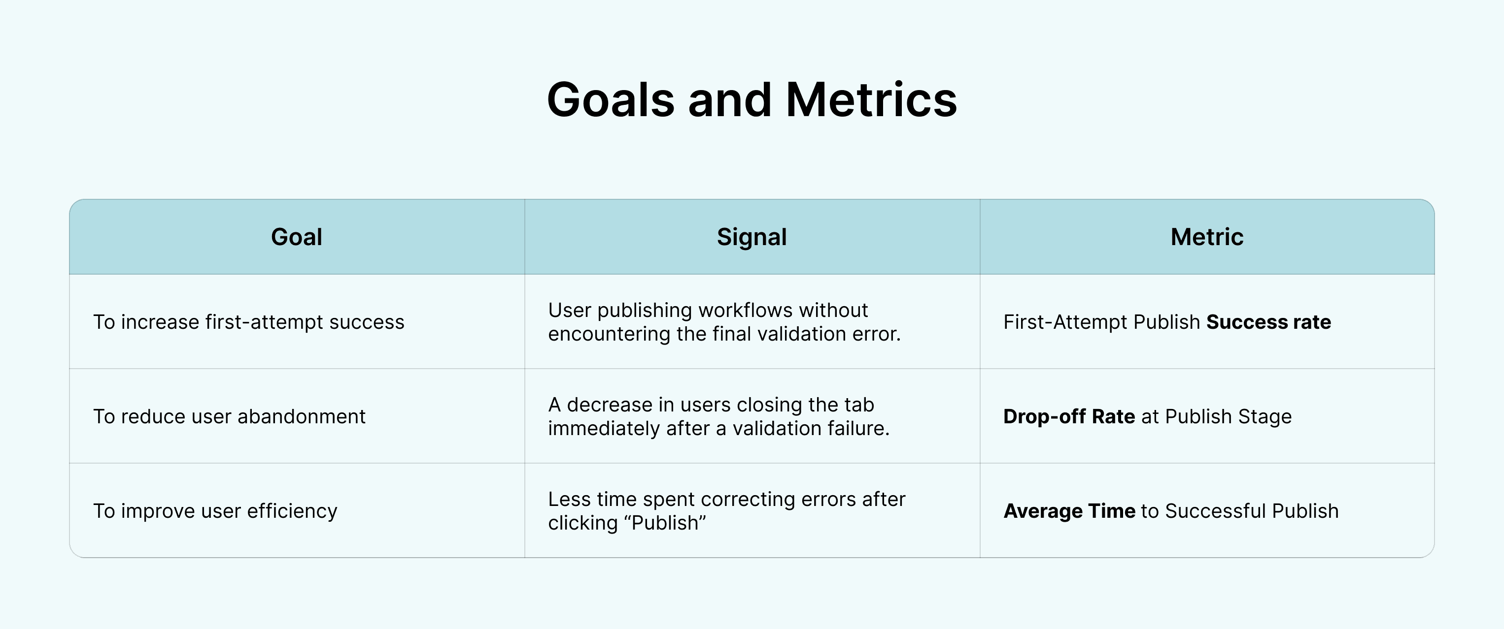 The goal of this project is to transform the workflow creation process from trial-and-error into a guided workflow building experience. By aligning policy constraints with the user's creation flow, the design aims to reduce late-stage errors and improve publishing success.